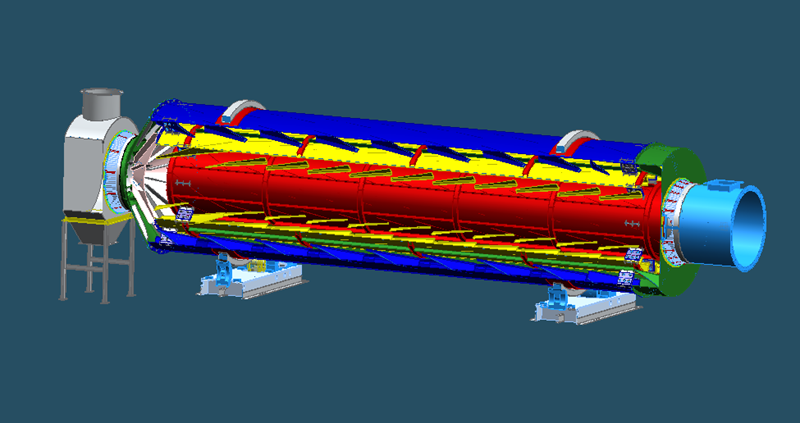 4、占地面積小,比單筒烘干機減少占地面積50%左右,土建投資降低50%左右,電耗降低60%左右。